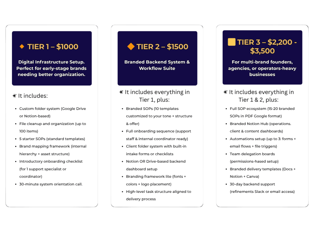 🧩 Done-for-you SOPs, CRMs, and backend tools, customized for your brand.